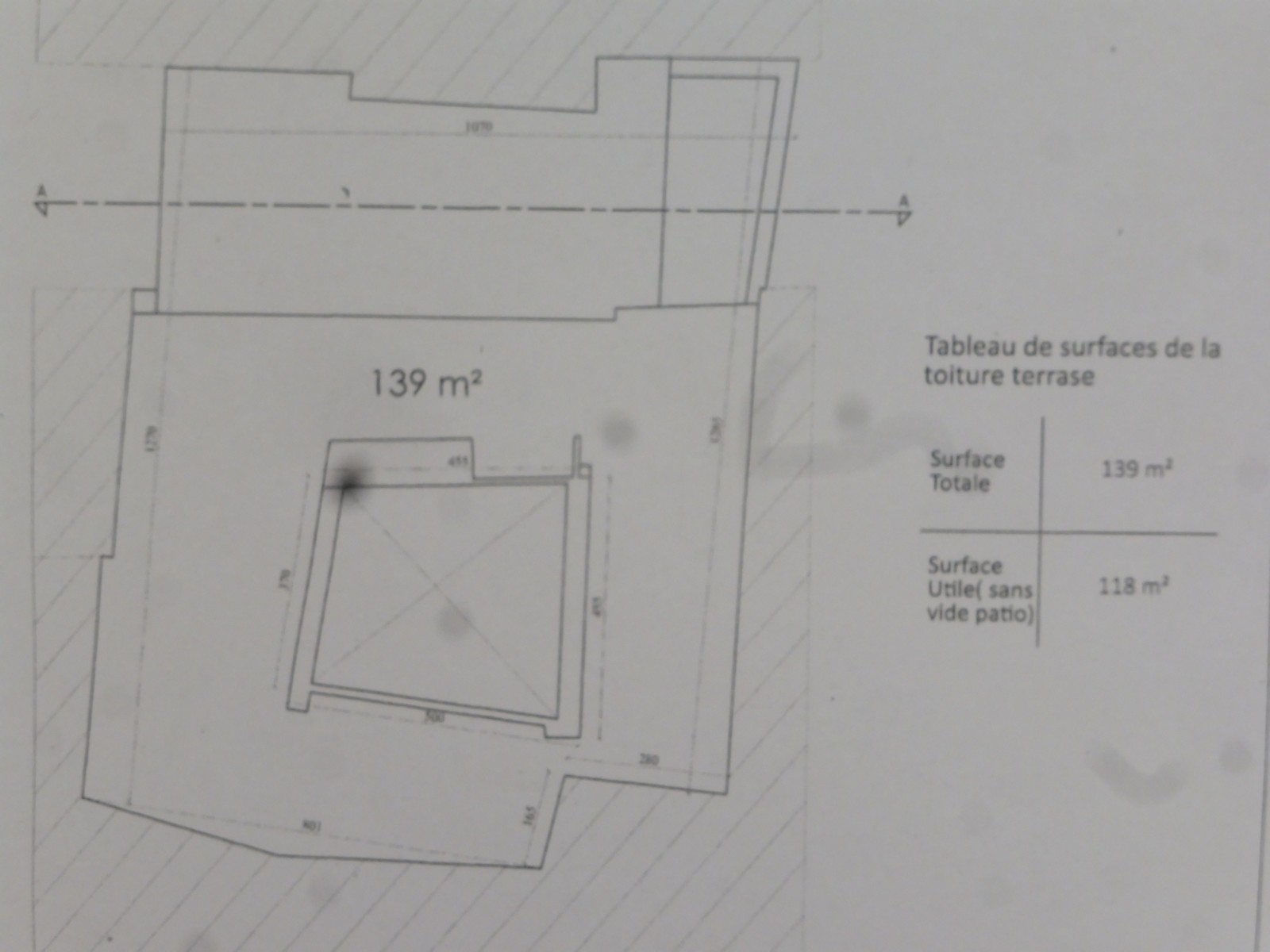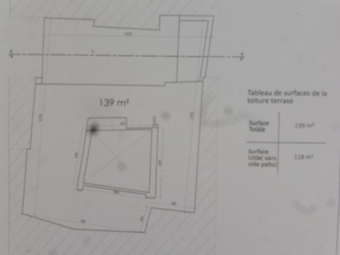 Terrasse : 139 m² de surface totale, avec 118 m² de surface utile (sans le vide du patio).