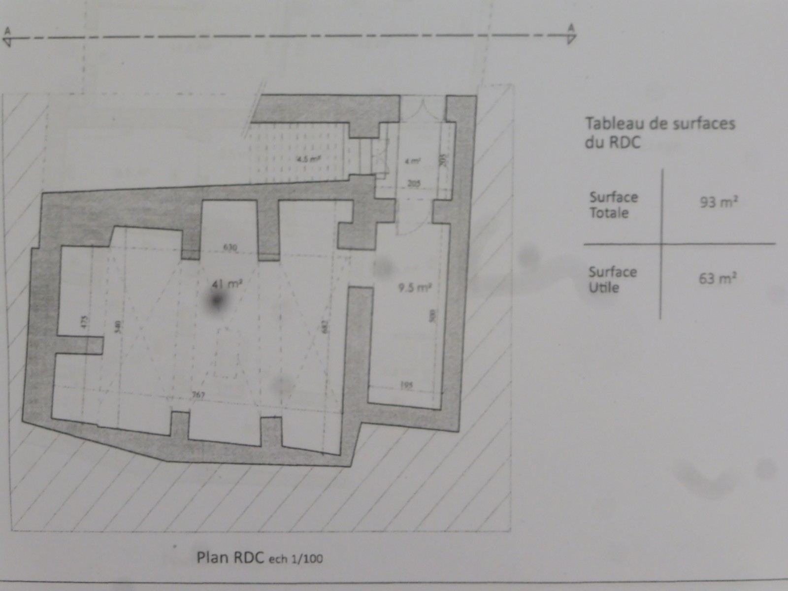 Rez-de-chaussée : 93 m² de surface totale, avec 63 m² de surface utile. Cet espace est est un entrepôt avec la possibilité d'être utilisé comme commerce.