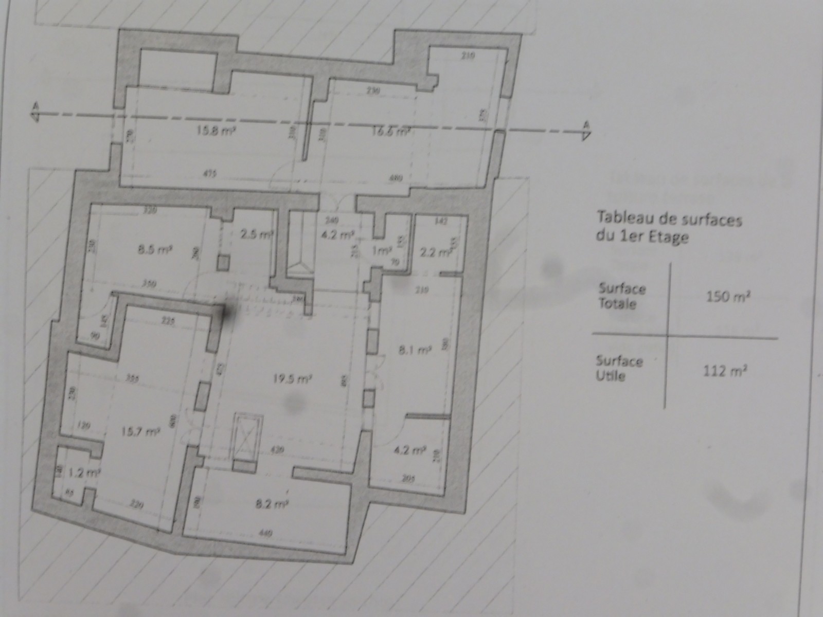 1er étage : 150 m² de surface totale, avec 112 m² de surface utile. Cet étage est destiné à l'habitation.
