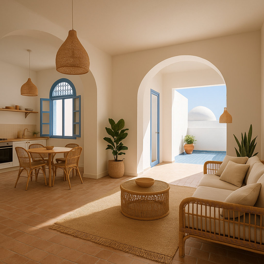 Pour transformer cet appartement situé dans la médina de Tunis en un espace moderne avec une seule pièce principale (cuisine ouverte, séjour, salon) et un accès à la terrasse, voici quelques idées et suggestions pour un intérieur blanc mais chaleureux :
